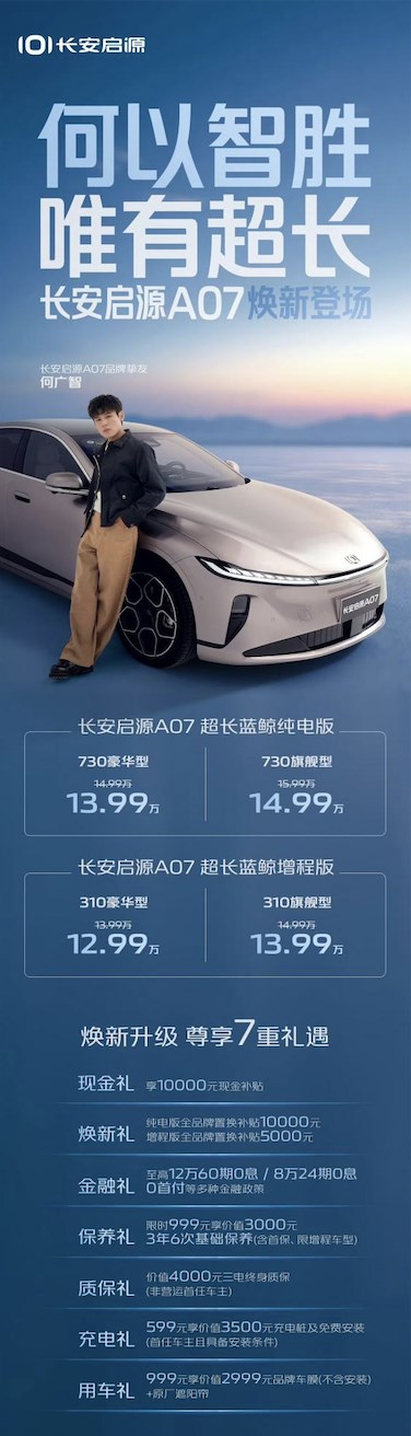9月10日,長(zhǎng)安啟源A07超長(zhǎng)藍(lán)鯨純電版/增程版煥新登場(chǎng),共推出4款車型,長(zhǎng)安啟源A07超長(zhǎng)藍(lán)鯨純電版 730豪華型、730旗艦型售價(jià)為13.99萬元、14.99萬元;長(zhǎng)安啟源A07超長(zhǎng)藍(lán)鯨增程版310豪華型、310旗艦型售價(jià)為12.99萬元、13.99萬元,并提供七重誠(chéng)意大禮,全面滿足用戶對(duì)于越級(jí)價(jià)值的需求。